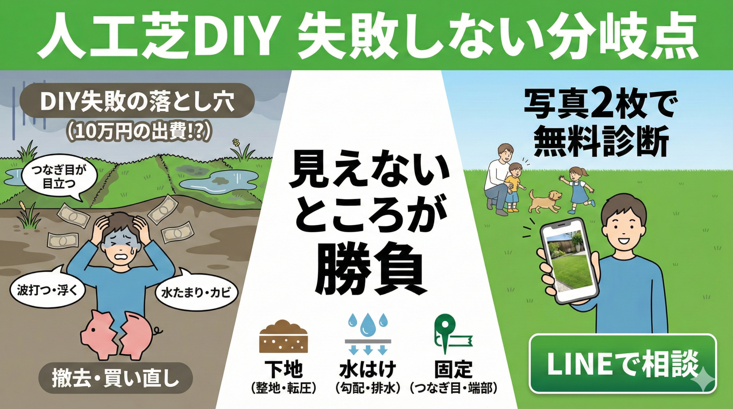 まず結論:人工芝DIYは「下地・水はけ・固定」で失敗する|DIYでいける人/プロ推奨の人