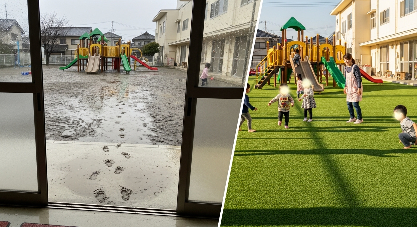 園庭が乾くまで待つ時間は、日課や活動計画に影響します。人工芝は、下地で水はけが機能していれば、雨上がりの回復が早くなります。